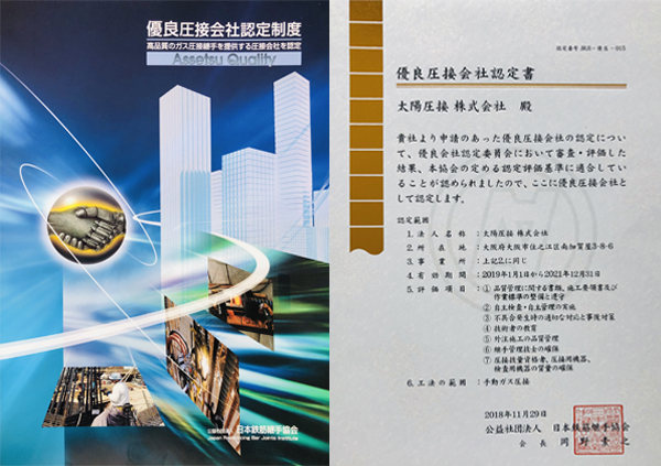 公益社団法人 日本鉄筋継手協会は、ガス圧接継手の品質向上のため、一定の審査基準に基づいて圧接会社の圧接施工体制、品質管理体制、品質管理能力を審査・評価し、「優良圧接会社」として認定しており、当社も認定制度スタート当初の平成9年より、継続して更新(3年ごとに審査)を重ねてまいりました。