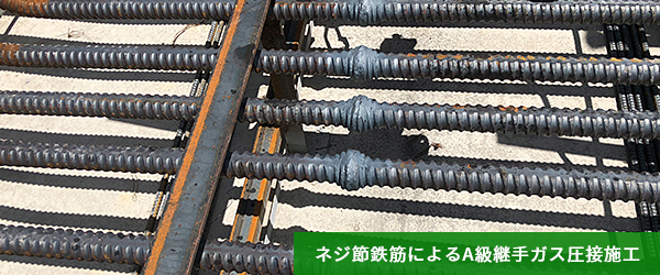 鉄筋ガス圧接継手工事においては、手動ガス圧接はもちろん、半自動ガス圧接、熱間押抜工法、A級継手ガス圧接、高強度鉄筋(SD490)の圧接等の施工が可能です。